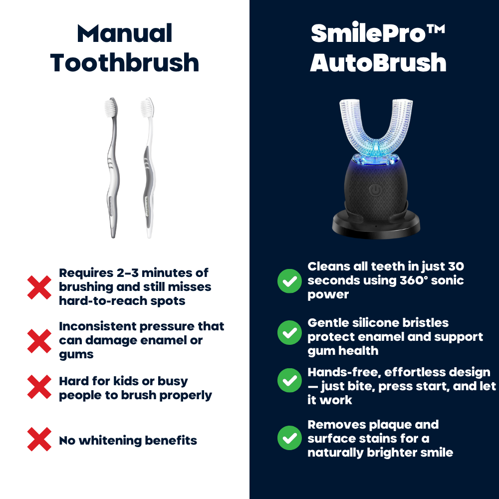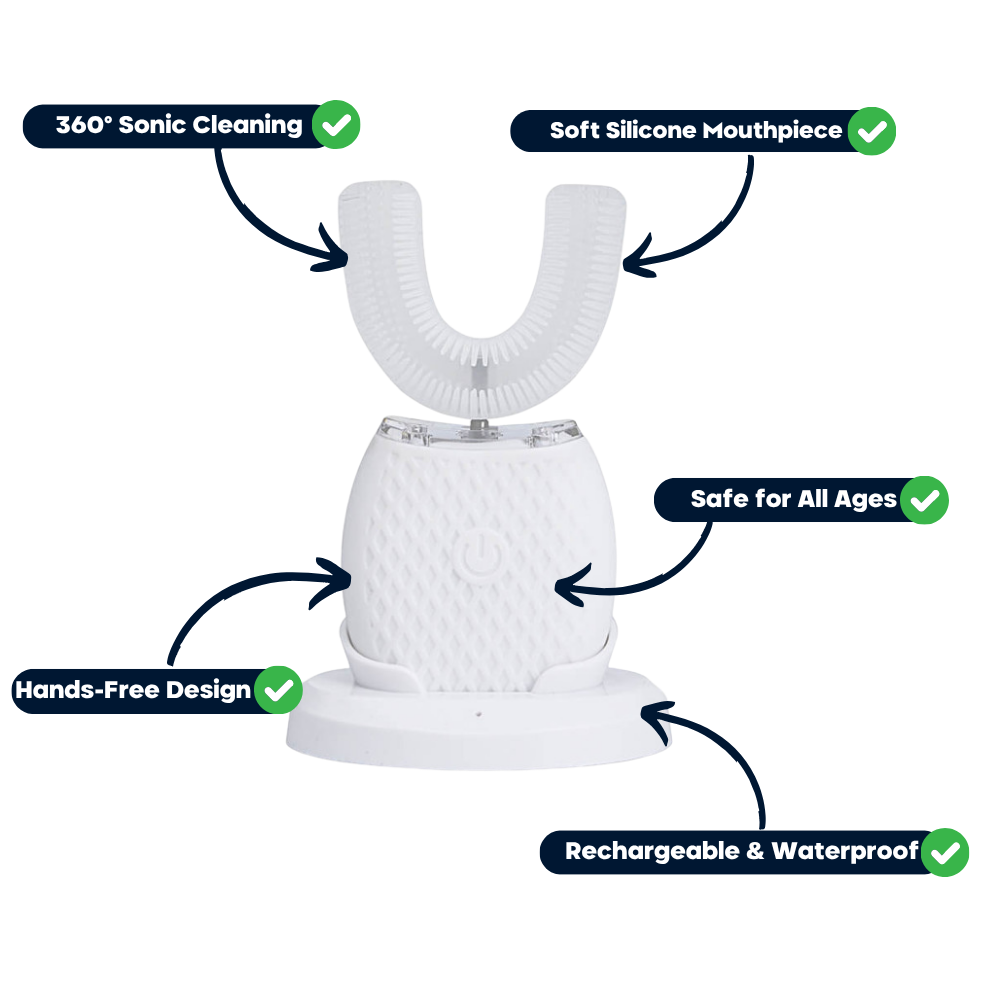 The U shaped sonic silicone toothbrush covers every tooth at once and standardises your routine in about a minute. Gentle silicone bristles and an optional blue light cosmetic mode help you keep a cleaner, brighter looking smile with less effort.